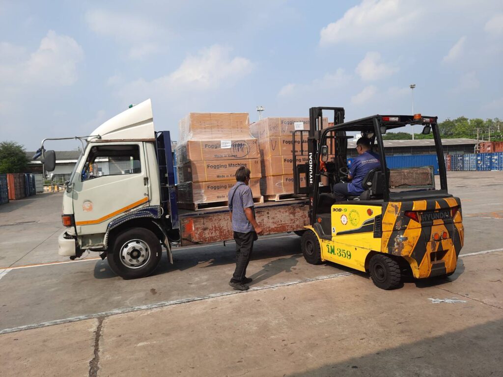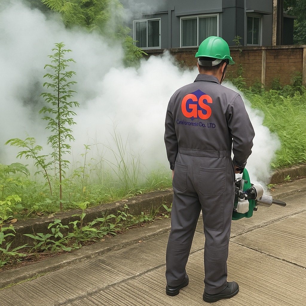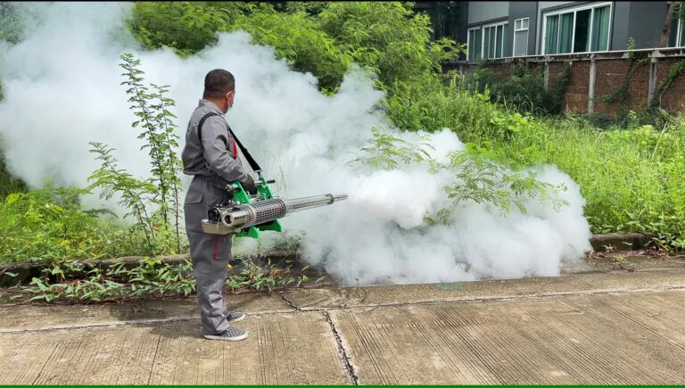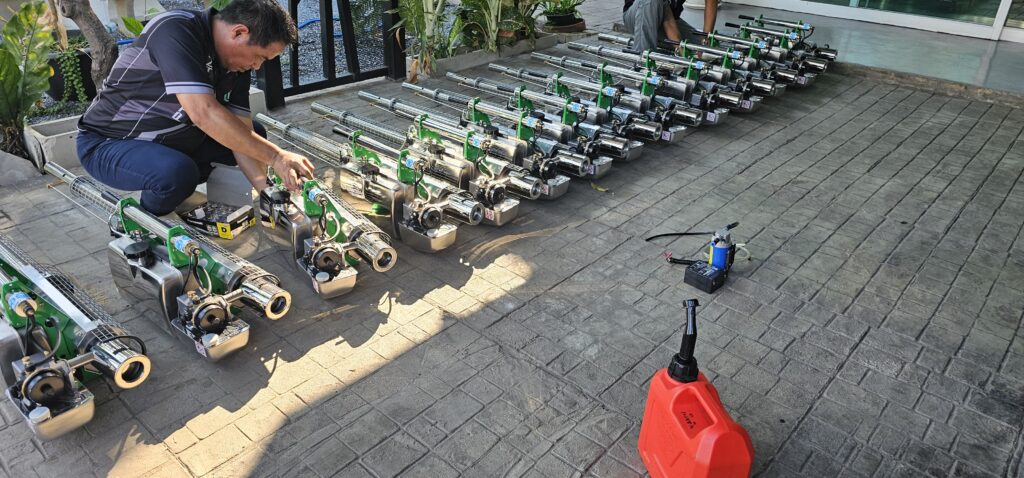 ตัวอย่างการพ่นหมอกควันภาพนี้ขาดการใส่หน้ากากป้องกันสารเคมี กรณีพ่นจริง ควรพ่นให้อยู่เหนือลม