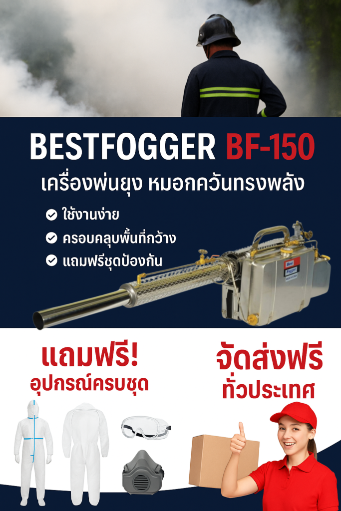 เครื่องพ่นหมอกควัน ยี่ห้อ Bestfogger รุ่น BF150 เหมาะสำหรับควบคุมยุงแมลง ในพื้นที่บริเวณกว้าง เช่นอาคาร บ้านสวน รีสอร์ท โรงเรียน ชุมชนเป็นต้น ใช้กับน้ำยา ที่มีสูตรผสมนำมันเป็นเครื่องสำหรับพ่น ระบบหมอกควันเท่านั้น น้ำหนักจะเบากว่าเครื่องพ่นรุ่น BF 200
